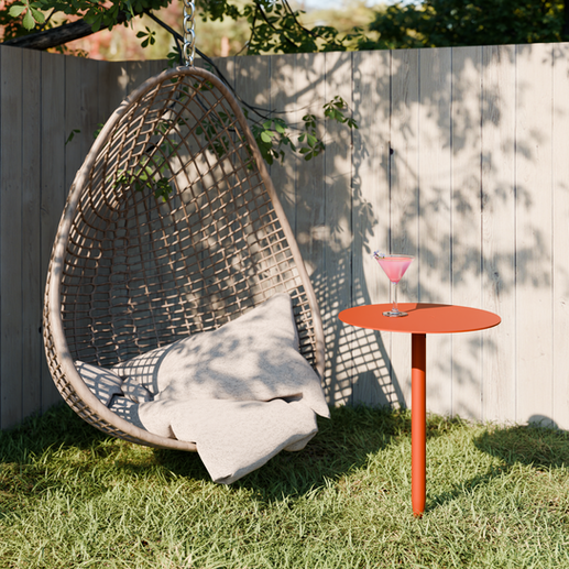 Drehe den verzinkten Fuß einfach wie eine große Schraube in den Boden und schon hast du einen standsicheren Beistelltisch.